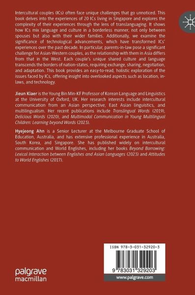 Intercultural couples (ICs) often face unique challenges that go unnoticed. This book delves into the experiences of 20 ICs living in Singapore and explores the complexity of their experiences through the lens of translanguaging. It shows how ICs mix language and culture in a borderless manner, not only between spouses but also with their wider families. Additionally, the authors examine the significance of technological advancements, which have transformed ICs' experiences over the past decade. In particular, parents-in-law pose a significant challenge for Asian-Western couples, as the relationship with them in Asia differs from that in the West. Each couple's unique shared culture and language transcends the borders of nation-states, requiring exchange, sharing, negotiation, and adaptation. This book provides an easy-to-read, holistic exploration of the issues faced by ICs, offering insight into overlooked aspects such as location, in-laws, and technology.