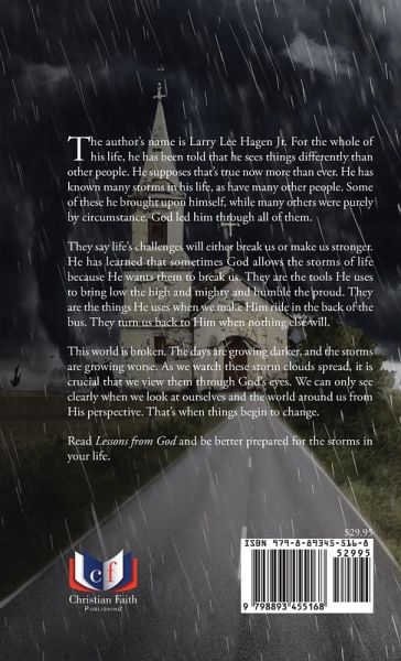 The author's name is Larry Lee Hagen Jr. For the whole of his life, he has been told that he sees things differently than other people. He supposes that's true now more than ever. He has known many storms in his life, as have many other people. Some of these he brought upon himself, while many others were purely by circumstance. God led him through all of them. They say life's challenges will either break us or make us stronger. He has learned that sometimes God allows the storms of life because He wants them to break us. They are the tools He uses to bring low the high and mighty and humble the proud. They are the things He uses when we make Him ride in the back of the bus. They turn us back to Him when nothing else will. This world is broken. The days are growing darker, and the storms are growing worse. As we watch these storm clouds spread, it is crucial that we view them through God's eyes. We can only see clearly when we look at ourselves and the world around us from His perspective. That's when things begin to change. Read Lessons from God and be better prepared for the storms in your life.
