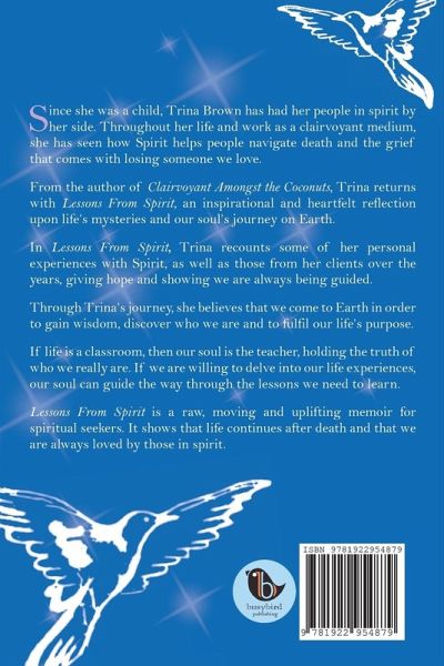 Since she was a child, Trina Brown has had her people in spirit by her side. Throughout her life and work as a clairvoyant medium, she has seen how Spirit helps people navigate death and the grief that comes with losing someone we love. From the author of Clairvoyant Amongst the Coconuts, Trina returns with Lessons From Spirit, an inspirational and heartfelt reflection upon life's mysteries and our soul's journey on Earth. In Lessons From Spirit, Trina recounts some of her personal experiences with Spirit, as well as those from her clients over the years, giving hope and showing we are always being guided. Through Trina's journey, she believes that we come to Earth in order to gain wisdom, discover who we are and to fulfil our life's purpose. If life is a classroom, then our soul is the teacher, holding the truth of who we really are. If we are willing to delve into our life experiences, our soul can guide the way through the lessons we need to learn. Lessons From Spirit is a raw, moving and uplifting memoir for spiritual seekers. It shows that life continues after death and that we are always loved by those in spirit.