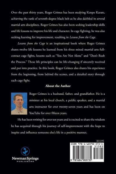 Over the past thirty years, Roger Grimes has been studying Kenpo Karate, achieving the rank of seventh-degree black belt as he also dabbled in several martial arts disciplines. Roger Grimes has also been seeking leadership skills and life lessons to improve his life and character. In cage fighting, he was also seeking learning for improvement, resulting in Lessons from the Cage. Lessons from the Cage is an inspirational book where Roger Grimes shares twelve life lessons he learned from his three mixed martial arts full-contact cage fights, lessons such as "You Are Not Alone" and "Don't Rush the Process." These life principles can be life-changing if sincerely received and put into practice. In this book, Roger Grimes also shares his experience from the beginning, from behind the scenes, and a detailed story through each cage fight.