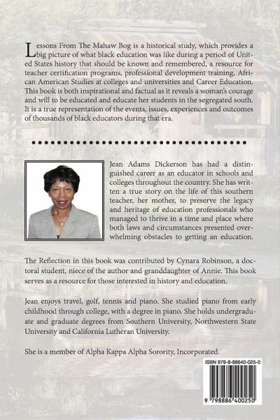Lessons From The Mahaw Bog is a historical study, which provides a big picture of what black education was like during a period of United States history that should be known and remembered, a resource for teacher certification programs, professional development training, African American Studies at colleges and universities and Career Education. This book is both inspirational and factual as it reveals a woman's courage and will to be educated and educate her students in the segregated south. It is a true representation of the events, issues, experiences and outcomes of thousands of black educators during that era.