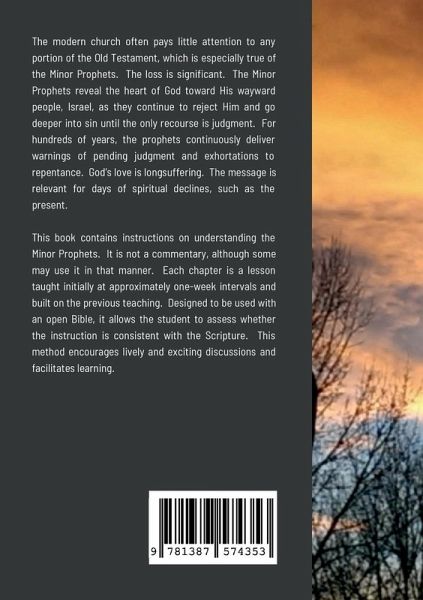 The Minor Prophets are for this present age. They speak to our day of spiritual decline. They relate God's perspective on the spiritual decline of Israel over hundreds of years until deportation and captivity were inevitable. Even after Israel was allowed to return to the land, formalism and ritual worship prevailed. God seeks those who worship in spirit and truth. God, however, knows the future and His Word is sure. Israel will be restored. Whatever God says will come to pass is certain. Understanding God's plan is not difficult when approached intelligently with sound interpretive principles. The story is fantastic. It is a God-sized story and difficult only because it taxes the human mind to more significant perceptions than usual. It makes us uncomfortable. We are not in control. This book aims to teach and improve understanding of the Minor Prophets. It is not a commentary, although some may use it as such. Each chapter is a lesson initially taught at approximately one-week intervals. Each lesson builds upon the previous teaching. The book is designed to be used with an open Bible and concurrent Scripture reading. The student can assess whether the instruction is consistent with the Scripture. Lively and exciting discussions are encouraged, and learning is facilitated. After all, the Word of God is guaranteed to impact hearts; Isaiah 55:11 teaches God's Word accomplishes His purpose.