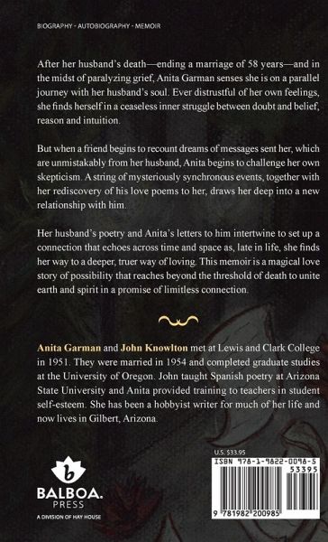 After her husband's death-ending a marriage of 58 years-and in the midst of paralyzing grief, Anita Garman senses she is on a parallel journey with her husband's soul. Ever distrustful of her own feelings, she finds herself in a ceaseless inner struggle between doubt and belief, reason and intuition. But when a friend begins to recount dreams of messages sent her, which are unmistakably from her husband, Anita begins to challenge her own skepticism. A string of mysteriously synchronous events, together with her rediscovery of his love poems to her, draws her deep into a new relationship with him. Her husband's poetry and Anita's letters to him intertwine to set up a connection that echoes across time and space as, late in life, she finds her way to a deeper, truer way of loving. This memoir is a magical love story of possibility that reaches beyond the threshold of death to unite earth and spirit in a promise of limitless connection.