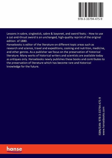 Lessons in sabre, singlestick, sabre & bayonet, and sword feats; - How to use a cut-and-thrust sword is an unchanged, high-quality reprint of the original edition of 1880.Hansebooks is editor of the literature on different topic areas such as research and science, travel and expeditions, cooking and nutrition, medicine, and other genres. As a publisher we focus on the preservation of historical literature. Many works of historical writers and scientists are available today as antiques only. Hansebooks newly publishes these books and contributes to the preservation of literature which has become rare and historical knowledge for the future.