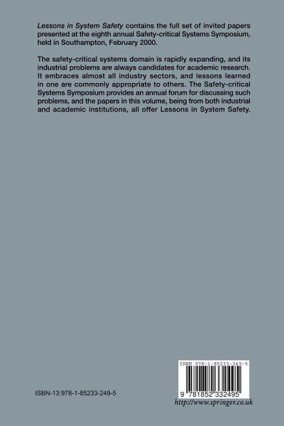 Lessons in System Safety contains the full set of invited papers presented at the Eighth Annual Safety-critical Systems Symposium, held in Southampton, February 2000. The safety-critical systems domain is rapidly expanding, and its industrial problems are always candidates for academic research. It embraces almost all industry sectors, and lessons learned in one are commonly appropriate to others. The Safety-critical Systems Symposium provides an annual forum for discussing such problems, and the papers in this volume, being from both industrial and academic institutions, all offer lessons in system safety.
