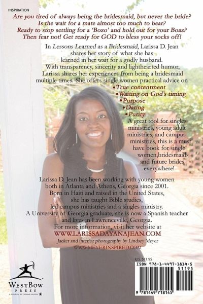 Are you tired of being always the bridesmaid, but never the bride? Is the wait for a mate almost too much to bear? Ready to stop settling for a Bozo and hold out for your Boaz? Fear not! Get ready for God to bless your socks off! In Lessons Learned as a Bridesmaid, Larissa D. Jean shares her story of what she has learned in her wait for a godly husband. With transparency, sincerity, and lighthearted humor, Larissa shares her experiences of being a bridesmaid multiple times. She offers single women practical advice on true contentment, waiting on God's timing, purpose, dating, and purity. A great tool for singles ministries, young adult ministries, and campus ministries, this is a great book for single women, bridesmaids, and future brides everywhere!