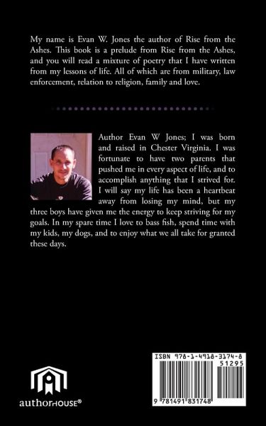 My name is Evan W. Jones the author of Rise from the Ashes. This book is a prelude from Rise from the Ashes, and you will read a mixture of poetry that I have written from my lessons of life. All of which are from military, law enforcement, relation to religion, family and love.