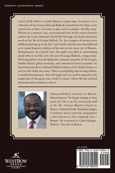 Lessons of My Father is a small tribute to a great man. A memoir, it is a collection of the lessons Edmund Bullock learned from his father as he stayed close to him-in work, in play, and in worship-for fifty years. Written in a smooth, easy, conversational style of the writer's favorite author, the iconic historian David McCullough, the book chronicles much of the life of George Bullock, Sr., the youngest of twenty-seven children growing up in the Jim Crow South, and the years that followed as he raised fourteen children of his own in the inner city of Boston, Massachusetts. In a lyrical voice, the author describes in entertaining detail what it was like to be the son of George Bullock, a larger-than-life loving father, firm disciplinarian, dynamic preacher of the Gospel, faithful friend, gifted musician, and committed church member. In humorous anecdotes, Edmund Bullock shares a little family history, as well as a bit of his own story. This is a compelling and moving tribute, a candid documentary. You will laugh and cry, and be amazed at the magnitude of this great man, small in stature, whose life has touched thousands and continues to do so.