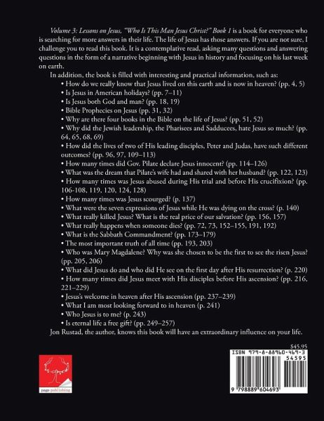 Volume 3: Lessons on Jesus, "Who Is This Man Jesus Christ?" Book 1 is a book for everyone who is searching for more answers in their life. The life of Jesus has those answers. If you are not sure, I challenge you to read this book. It is a contemplative read, asking many questions and answering questions in the form of a narrative beginning with Jesus in history and focusing on his last week on earth. In addition, the book is filled with interesting and practical information, such as: How do we really know that Jesus lived on this earth and is now in heaven? (pp. 4, 5) Is Jesus in American holidays? (pp. 7-11) Is Jesus both God and man? (pp. 18, 19) Bible Prophecies on Jesus (pp. 31, 32) Why are there four books in the Bible on the life of Jesus? (pp. 51, 52) Why did the Jewish leadership, the Pharisees and Sadducees, hate Jesus so much? (pp. 64, 65, 68, 69) How did the lives of two of His leading disciples, Peter and Judas, have such different outcomes? (pp. 96, 97, 109-113) How many times did Gov. Pilate declare Jesus innocent? (pp. 114-126) What was the dream that Pilate's wife had and shared with her husband? (pp. 122, 123) How many times was Jesus abused during His trial and before His crucifixion? (pp. 106-108, 119, 120, 124, 128) How many times was Jesus scourged? (p. 137) What were the seven expressions of Jesus while He was dying on the cross? (p. 140) What really killed Jesus? What is the real price of our salvation? (pp. 156, 157) What really happens when someone dies? (pp. 72, 73, 152-155, 191, 192) What is the Sabbath Commandment? (pp. 173-179) The most important truth of all time (pp. 193, 203) Who was Mary Magdalene? Why was she chosen to be the first to see the risen Jesus? (pp. 205, 206) What did Jesus do and who did He see on the first day after His resurrection? (p. 220) How many times did Jesus meet with His disciples before His ascension? (pp. 216, 221-229) Jesus's welcome in heaven after His ascension (pp. 237-239) What I am most looking forward to in heaven (p. 241) Who Jesus is to me? (p. 243) Is eternal life a free gift? (pp. 249-257) Jon Rustad, the author, knows this book will have an extraordinary influence on your life.
