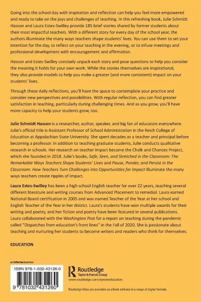 Going into the school day with inspiration and reflection can help you feel more empowered and ready to take on the joys and challenges of teaching. In this refreshing book, Julie Hasson and Laura Estes-Swilley provide 185 brief stories shared by former students about their most impactful teachers.
