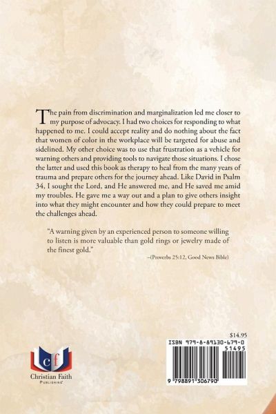 The pain from discrimination and marginalization led me closer to my purpose of advocacy. I had two choices for responding to what happened to me. I could accept reality and do nothing about the fact that women of color in the workplace will be targeted for abuse and sidelined. My other choice was to use that frustration as a vehicle for warning others and providing tools to navigate those situations. I chose the latter and used this book as therapy to heal from the many years of trauma and prepare others for the journey ahead. Like David in Psalm 34, I sought the Lord, and He answered me, and He saved me amid my troubles. He gave me a way out and a plan to give others insight into what they might encounter and how they could prepare to meet the challenges ahead. "A warning given by an experienced person to someone willing to listen is more valuable than gold rings or jewelry made of the finest gold" (Proverbs 25:12, Good News Bible).
