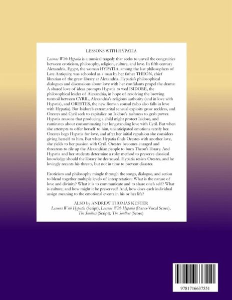 Lessons With Hypatia is a musical tragedy that seeks to unveil the congruities between eroticism, philosophy, religion, culture, and love. In fifth century Alexandria, Egypt, the woman HYPATIA, among the last philosophers of Late Antiquity, was schooled as a man by her father THEON, chief librarian of the great library at Alexandria. Hypatia's philosophical dialogues and discussions about love with her confidants propel the drama: A shared love of ideas prompts Hypatia to wed ISIDORE, the philosophical leader of Alexandria, in hope of resolving the brewing turmoil between CYRIL, Alexandria's religious authority (and in love with Hypatia), and ORESTES, the new Roman consul (who also falls in love with Hypatia). But Isidore's extramarital sensual exploits grow reckless, and Orestes and Cyril seek to capitalize on Isidore's rashness to grab power. Hypatia reasons that producing a child might protect Isidore, and ruminates about consummating her longstanding love with Cyril. But when she attempts to offer herself to him, unanticipated emotions terrify her. Orestes begs Hypatia for love, and after her initial repulsion she considers giving herself to him. But when Hypatia finds Orestes with another love, she yields to her passion with Cyril. Orestes becomes enraged and threatens to rile up the Alexandrian people to burn Theon's library. And Hypatia and her students determine a risky method to preserve classical knowledge should the library be destroyed. Hypatia resists Orestes, and he lovingly recants his threats, but not in time to prevent disaster. Eroticism and philosophy mingle through the songs, dialogue, and action to blend together multiple levels of interpretation: What is the nature of love and divinity? What it is to communicate and to share one's self? What is culture, and how might it be preserved? And, how does each individual assign meaning to the emotional events in his or her life?