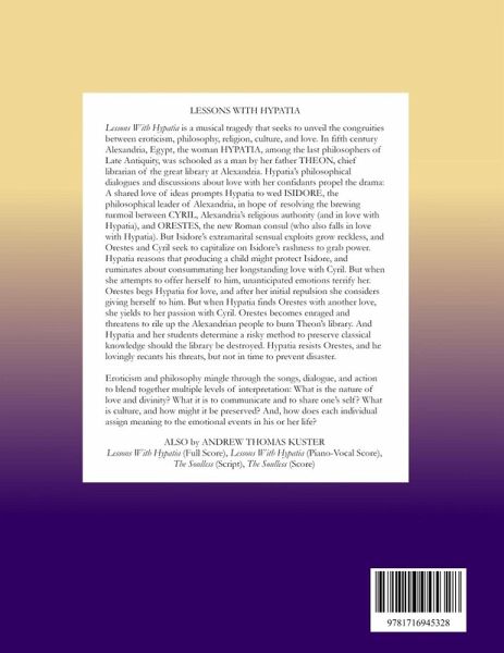 Lessons With Hypatia is a musical tragedy that seeks to unveil the congruities between eroticism, philosophy, religion, culture, and love. In fifth century Alexandria, Egypt, the woman HYPATIA, among the last philosophers of Late Antiquity, was schooled as a man by her father THEON, chief librarian of the great library at Alexandria. Hypatia's philosophical dialogues and discussions about love with her confidants propel the drama: A shared love of ideas prompts Hypatia to wed ISIDORE, the philosophical leader of Alexandria, in hope of resolving the brewing turmoil between CYRIL, Alexandria's religious authority (and in love with Hypatia), and ORESTES, the new Roman consul (who also falls in love with Hypatia). But Isidore's extramarital sensual exploits grow reckless, and Orestes and Cyril seek to capitalize on Isidore's rashness to grab power. Hypatia reasons that producing a child might protect Isidore, and ruminates about consummating her longstanding love with Cyril. But when she attempts to offer herself to him, unanticipated emotions terrify her. Orestes begs Hypatia for love, and after her initial repulsion she considers giving herself to him. But when Hypatia finds Orestes with another love, she yields to her passion with Cyril. Orestes becomes enraged and threatens to rile up the Alexandrian people to burn Theon's library. And Hypatia and her students determine a risky method to preserve classical knowledge should the library be destroyed. Hypatia resists Orestes, and he lovingly recants his threats, but not in time to prevent disaster. Eroticism and philosophy mingle through the songs, dialogue, and action to blend together multiple levels of interpretation: What is the nature of love and divinity? What it is to communicate and to share one's self? What is culture, and how might it be preserved? And, how does each individual assign meaning to the emotional events in his or her life?