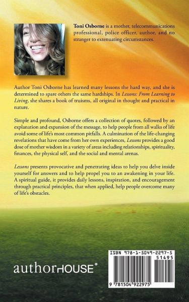 Author Toni Osborne has learned many lessons the hard way, and she is determined to spare others the same hardships. In Lessons: From Learning to Living, she shares a book of truisms, all original in thought and practical in nature. Simple and profound, Osborne offers a collection of quotes, followed by an explanation and expansion of the message, to help people from all walks of life avoid some of life's most common pitfalls. A culmination of the life-changing revelations that have come from her own experiences, Lessons provides a good dose of mother wisdom in a variety of areas including relationships, spirituality, finances, the physical self, and the social and mental arenas. Lessons presents provocative and penetrating ideas to help you delve inside yourself for answers and to help propel you to an awakening in your life. A spiritual guide, it provides daily lessons, inspiration, and encouragement through practical principles, that when applied, help people overcome many of life's obstacles.