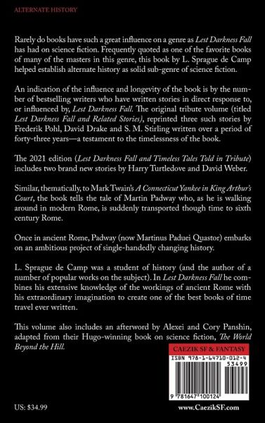 Rarely do books have such a great influence on a genre as Lest Darkness Fall has had on science fiction. Frequently quoted as one of the favorite books of many of the masters in this genre, this book by L. Sprague de Camp helped establish alternate-history as solid subgenre of science fiction. An indication of the influence and longevity of the book is by the number of best-selling writers who have written stories in direct response to, or influenced by, Lest Darkness Fall. The original tribute volume. titled Lest Darkness Fall and Related Stories, reprinted three such stories by Frederik Pohl, David Drake and S. M. Stirling written over a period of forty-three years―a testament to the timelessness of the book. The 2021 edition Lest Darkness Fall and Timeless Tales Told in Tribute includes two brand new stories by Harry Turtledove and David Weber. Similar thematically to Mark Twain’s A Connecticut Yankee in King Arthur’s Court, the book tells the tale of Martin Padway who, as he is walking around in modern Rome, is suddenly transported though time to 6th-century Rome. Once in ancient Rome, Padway (now Martinus Paduei Quastor) embarks on an ambitious project of single-handedly changing history. L. Sprague de Camp was a student of history (and the author of a number of popular works on the subject). In Lest Darkness Fall he combines his extensive knowledge of the workings of ancient Rome with his extraordinary imagination to create one of the best books of time travel ever written. This volume also includes an afterword by Alexei and Cory Panshin, adapted from their Hugo-winning book on science fiction, The World Beyond the Hill .