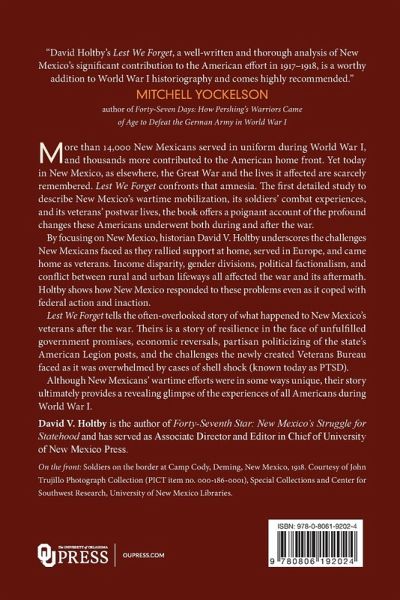 More than 14,000 New Mexicans served in uniform during World War I, and thousands more contributed to the American home front. Yet today in New Mexico, as elsewhere, the Great War and the lives it affected are scarcely remembered. Lest We Forget confronts that amnesia. The first detailed study to describe New Mexico's wartime mobilization, its soldiers' combat experiences, and its veterans' postwar lives, the book offers a poignant account of the profound changes these Americans underwent both during and after the war. By focusing on New Mexico, historian David V. Holtby underscores the challenges New Mexicans faced as they rallied support at home, served in Europe, and came home as veterans. Income disparity, gender divisions, political factionalism, and conflict between rural and urban lifeways all affected the war and its aftermath. Holtby shows how New Mexico responded to these problems even as it coped with federal action and inaction. In more than 1,500 eyewitness statements collected in Spanish and English not long after the war ended, New Mexicans described the murderous effects of shrapnel and gas warfare, the impact of the Spanish influenza, and the many other challenges they faced on the front as members of the American Expeditionary Forces. Lest We Forget recounts the background of these soldiers, but it also tells the often-overlooked story of what happened to New Mexico's veterans after the war. Theirs is a story of resilience in the face of unfulfilled government promises, economic reversals, partisan politicizing of the state's American Legion posts, and the challenges the newly created Veterans Bureau faced as it was overwhelmed by cases of shell shock (known today as PTSD). Although New Mexicans' wartime efforts were in some ways unique, their story ultimately provides a revealing glimpse of the experiences of all Americans during World War I. A timely reminder of the courage and tragedy that accompany full-scale modern warfare, Lest We Forget reminds us of the enduring legacy of a vast international conflict that had keenly felt and long-lasting repercussions back home.