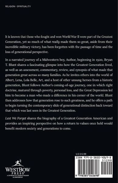Lest We Forget: Lessons Learned from the Greatest Generation follows the story of a boy born into a poor Midwestern family in 1920-a boy who, by virtue of right doctrine, grew through poverty, personal loss, and the Great Depression to become a man who made a difference in his corner of the world. But that story is viewed through the lens of a bigger picture, one that sees his growth as a microcosm of what was simultaneously taking place across the country, the result of which was victory in the largest and deadliest conflict the world has ever known. What is presented here is not a review of the heroic exploits accomplished by the 1901-1927 American cohort into which that boy was born. Much has been written about those. Rather, Lest We Forget brings to bear a case of cause and effect, one that addresses the question regarding how it was that they could rise to such greatness when generations since then evidently cannot. In the end, the book offers a path to begin turning the slide of American generational distinction back to that which was last seen in those whom we refer to as the Greatest Generation.
