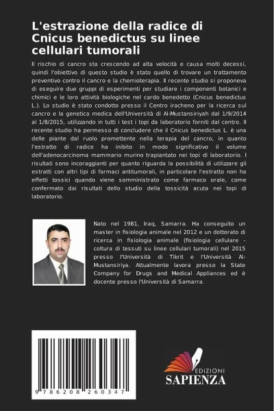 Il rischio di cancro sta crescendo ad alta velocità e causa molti decessi, quindi l'obiettivo di questo studio è stato quello di trovare un trattamento preventivo contro il cancro e la chemioterapia. Il recente studio si proponeva di eseguire due gruppi di esperimenti per studiare i componenti botanici e chimici e le loro attività biologiche nel cardo benedetto (Cnicus benedictus L.). Lo studio è stato condotto presso il Centro iracheno per la ricerca sul cancro e la genetica medica dell'Università di Al-Mustansiriyah dal 1/9/2014 al 1/8/2015, utilizzando in tutti i test i topi da laboratorio forniti dal centro. Il recente studio ha permesso di concludere che il Cnicus benedictus L. è una delle piante dal ruolo promettente nella terapia del cancro, in quanto l'estratto di radice ha inibito in modo significativo il volume dell'adenocarcinoma mammario murino trapiantato nei topi di laboratorio. I risultati sono incoraggianti per quanto riguarda la possibilità di utilizzare gli estratti con altri tipi di farmaci antitumorali, in particolare l'estratto non ha effetti tossici quando viene somministrato come farmaco orale, come confermato dai risultati dello studio della tossicità acuta nei topi di laboratorio.