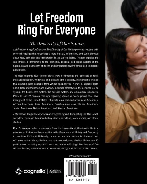 Let Freedom Ring For Everyone: The Diversity of Our Nation provides students with selected readings that encourage a more fruitful, informative, and open dialogue about race, ethnicity, and immigration in the United States. The text explores the vast impact of immigrants to the economic, political, and social systems of the nation, as well as modern attitudes and perceptions toward ethnic and immigrant populations. The book features four distinct parts. Part I introduces the concepts of race, institutional racism, whiteness, and race and ethnic equality, then presents articles that examine these concepts from various perspectives. In Part II, students learn about tools of dominance and division, including stereotypes, the criminal justice system, the health care system, the political system, and educational structures. Parts III and IV contain readings regarding various minority groups that have immigrated to the United States. Students learn and read about Arab Americans, African Americans, Asian Americans, Brazilian Americans, Haitian Americans, Jewish Americans, Native Americans, and Nigerian Americans. Let Freedom Ring For Everyone is an enlightening and illuminating text that is well suited for courses in American history, American culture, black studies, and ethnic studies. Eric R. Jackson holds a doctorate from the University of Cincinnati. He is a professor of history and black studies in the Department of History and Geography at Northern Kentucky University, where he teaches courses in American and African American history/studies, race relations, and peace studies. He has over 50 publications, including articles in such journals as Africology: The Journal of Pan African Studies, Journal of African American History, and Journal of World Peace.