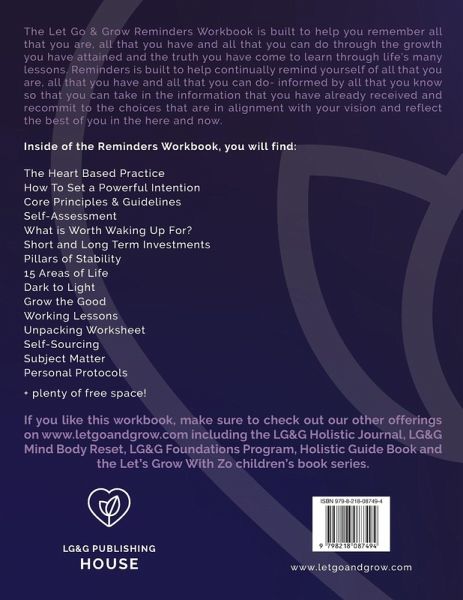 The Let Go & Grow Reminders Workbook is built to help you remember all that you are, all that you have and all that you can do through the growth you have attained and the truth you have come to learn through life's many lessons. Reminders is built to help continually remind yourself of all that you are, all that you have and all that you can do- informed by all that you know so that you can take in the information that you have already received and recommit to the choices that are in alignment with your vision and reflect the best of you in the here and now. Inside of the Reminders Workbook, you will find: The Heart Based Practice How To Set a Powerful Intention Core Principles & Guidelines Self-Assessment What is Worth Waking Up For? Short and Long Term Investments Pillars of Stability 15 Areas of Life Dark to Light Grow the Good Working Lessons Unpacking Worksheet Self-Sourcing Subject Matter Personal Protocols Free Space If you like this workbook, make sure to check out our other offerings on www.letgoandgrow.com including the LG&G Holistic Journal, LG&G Mind Body Reset, LG&G Foundations Program, Holistic Guide Book and the Let's Grow With Zo children's book series.