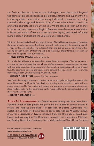 Let Go is a collection of poems that challenges the reader to look beyond the gamut of preconceived ideas, prejudices, egotism, and superiority. It is in casting aside these traits that every individual is perceived as being created in the image and likeness of our Creator who is Love. Love is the primordial characteristic of our true self. We are called to filter out all that is not of our true nature and begin tabula rasa--with a newness of vision in heart and mind--if we are to restore the dignity and worth of every human person and uphold the value of our created order.