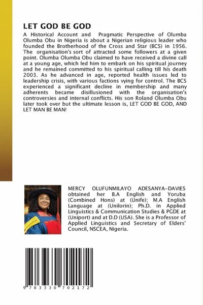 A Historical Account and Pragmatic Perspective of Olumba Olumba Obu in Nigeria is about a Nigerian religious leader who founded the Brotherhood of the Cross and Star (BCS) in 1956. The organisation's sort of attracted some followers at a given point. Olumba Olumba Obu claimed to have received a divine call at a young age, which led him to embark on his spiritual journey and he remained committed to his spiritual calling till his death 2003. As he advanced in age, reported health issues led to leadership crisis, with various factions vying for control. The BCS experienced a significant decline in membership and many adherents became disillusioned with the organisation's controversies and internal conflicts. His son Roland Olumba Obu later took over but the ultimate lesson is, LET GOD BE GOD, AND LET MAN BE MAN!