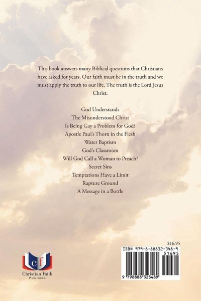 This book answers many Biblical questions that Christians have asked for years. Our faith must be in the truth and we must apply the truth to our life. The truth is the Lord Jesus Christ. God Understands The Misunderstood Christ Is Being Gay a Problem for God? Apostle Paul's Thorn in the Flesh Water Baptism God's Classroom Will God Call a Woman to Preach? Secret Sins Temptations Have a Limit Rapture Ground A Message in a Bottle