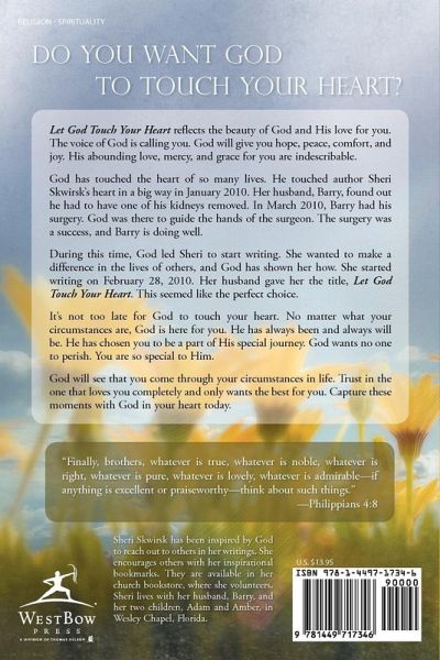 Let God Touch Your Heart reflects the beauty of God and His love for you. The voice of God is calling you. God will give you hope, peace, comfort, and joy. His abounding love, mercy, and grace for you are indescribable. God has touched the heart of so many lives. He touched author Sheri Skwirsk's heart in a big way in January 2010..Her husband, Barry, found out he had to have one of his kidneys removed. In March 2010, Barry had his surgery. God was there to guide the hands of the surgeon. The surgery was a success, and Barry is doing well. During this time, God led Sheri to start writing. She wanted to make a difference in the lives of others, and God has shown her how. She started writing on February 28, 2010. Her husband gave her the title, Let God Touch Your Heart. This seemed like the perfect choice. It's not too late for God to touch your heart. No matter what your circumstances are, God is here for you. He has always been and always will be. He has chosen you to be a part of His special journey. God wants no one to perish. You are so special to Him. God will see that you come through your circumstances in life. Trust in the one that loves you completely and only wants the best for you. Capture these moments with God in your heart today. "Finally, brothers, whatever is true, whatever is noble, whatever is right, whatever is pure, whatever is lovely, whatever is admirable-if anything is excellent or praiseworthy-think about such things." -Philippians 4:8