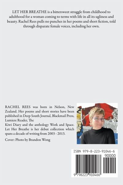 How do you tell her? You may feel scared because you are a woman now. But always the girl with permission to dream. And dreams are free-they are free. How do you tell her? LET HER BREATHE is a bittersweet struggle from childhood to adulthood for a woman coming to terms with life in all its ugliness and beauty. Rachel Rees pulls no punches in her poems and short fiction, told through disparate female voices, including her own. "Palpable. Yes." - Penelope Todd, author of Digging for Spain: A Writer's Journey.
