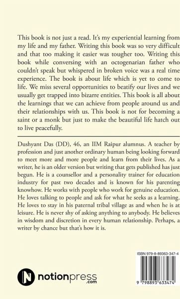 This book is not just a read. It's my experiential learning from my life and my father. Writing this book was so very difficult and that too making it easier was tougher too. Writing this book while conversing with an octogenarian father who couldn't speak but whispered in broken voice was a real time experience. The book is about life which is yet to come to life. We miss several opportunities to beatify our lives and we usually get trapped into bizarre entities. This book is all about the learnings that we can achieve from people around us and their relationships with us. This book is not for becoming a saint or a monk but just to make the beautiful life hatch out to live peacefully.