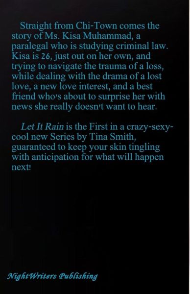 Straight from Chi-Town comes the story of Ms. Kisa Muhammad, a paralegal who is studying criminal law. Kisa is 26, just out on her own, and trying to navigate the trauma of a loss, while dealing with the drama of a lost love, a new love interest, and a best friend who's about to surprise her with news she really doesn't want to hear. Let It Rain is the First in a crazy-sexy-cool new Series by Tina Smith, guaranteed to keep your skin tingling with anticipation for what will happen next!