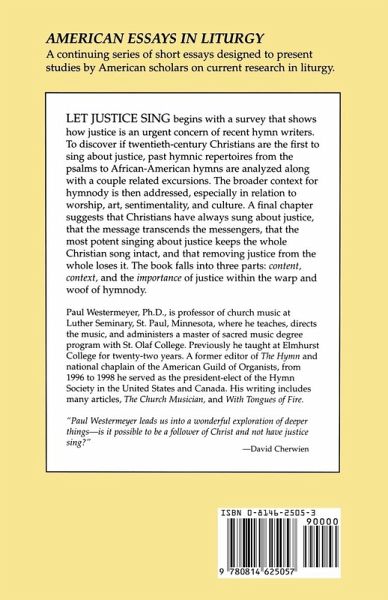 LET JUSTICE SING begins with a survey that shows how justice is an urgent concern of recent hymn writers. To discover if twentieth-century Christians are the first to sing about justice, past hymnic repertoires from the psalms to African-American hymns are analyzed along with a couple related excursions. The broader context for hymnody is then addressed, especially in relation to worship, art, sentimentality, and culture. A final chapter suggests that Christians have always sung about justice, that the message transcends the messengers, that the most potent singing about justice keeps the whole Christian song intact, and that removing justice from the whole loses it. The book falls into three parts: content, context, and the importance of justice within the warp and woof of hymnody.