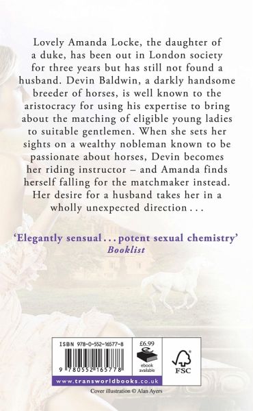 Lovely Amanda Locke, the daughter of a duke, has been out in London society for three years but has still not found a husband. Devin Baldwin, a darkly handsome breeder of horses, is well known for using his expertise to bring about the matching of eligible young ladies to suitable gentlemen - and becomes Amanda's riding instructor.