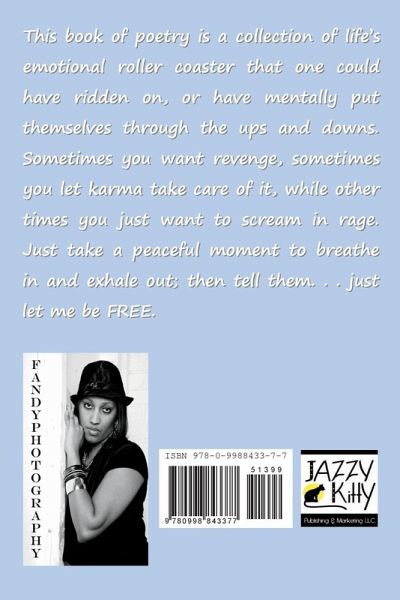 This book of poetry is a collection of life's emotional roller coaster that one could have ridden on, or have mentally put themselves through the ups and downs. Sometimes you want revenge, sometimes you let karma take care of it, while other times you just want to scream in rage. Just take a peaceful moment to breathe in and exhale out; then tell them. . . just let me be FREE.