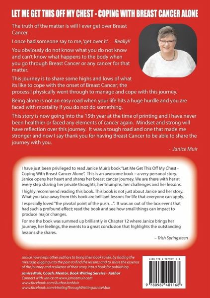 The truth of the matter is will I ever get over Breast Cancer. I once had someone say to me 'Get over it'. "Really!!" You obviously do not know what you do not know and can't know what happens to the body when you go through Breast Cancer or any cancer for that matter. This journey is to share some highs and lows of what is like to cope with the onset of Breast Cancer; the process I physically went through to manage and cope with this journey. Being alone is not an easy road when your life hits a huge hurdle and you are faced with mortality if you do not do something. This story is now going into the 15th year at the time of printing and I have never been healthier or faced any elements of cancer again. Mindset and strong will have reflection over this journey. It was a tough road and one that made me stronger and now I say thank you for having Breast Cancer to be able to share the journey with you. - Janice Muir