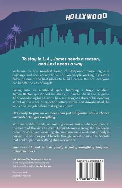 Welcome to Los Angeles! Home of Hollywood magic, high-rise buildings, and occasionally hope. For creatives, it's one of the best places to build a career, but not everyone can handle the city of angels. He needs a reason to stay. She needs a way. Falling into an emotional spiral following a tragic accident, James Barton questioned his ability to handle life in Los Angeles. After abandoning his passions, he was staring at a stack of bills looming as tall as the stack of rejection letters. Broke and downhearted, he lands one last job before making his choice. He's ready to give up on more than just LA, until a chance encounter changes everything. With incredible friends, an amazing career, and a cute apartment in the heart of the Arts District, Alexis Strauss is living the California dream. She'll admit her dating life could use some work, but nobody is perfect. Behind her joyful facade, though, secrets haunt her. Secrets that could upend everything she's worked for. She loves LA, but a toxic family is doing everything they can to hold her back. Co-workers in love, found family, and he falls first tropes are just a taste of what you can expect in this contemporary romance novel. Packed with raw, powerful emotions, and a sprinkling of spice, Let Me Love You Anyway is book one in the Hollywoodland series and author Jordyn Barnes's debut novel.