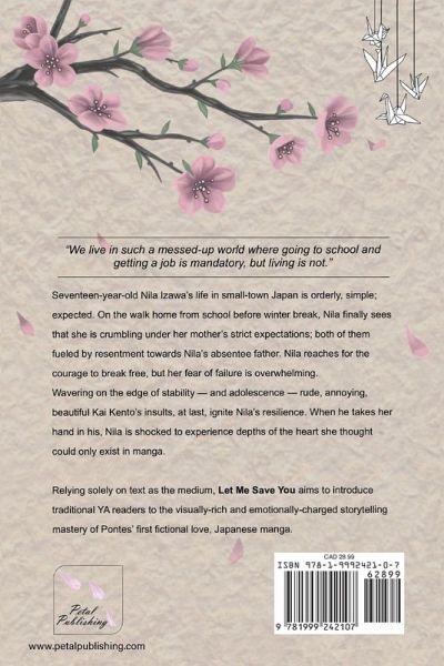 "We live in such a messed-up world where going to school and getting a job is mandatory, but living is not." Seventeen-year-old Nila Izawa's life in small-town Japan is orderly, simple, expected. On the walk home from school before winter break, Nila finally sees that she is crumbling under her mother's strict expectations, both of them fueled by resentment towards Nila's absentee father. Nila reaches for the courage to break free, but her fear of failure is overwhelming. Wavering on the edge of stability - and adolescence - rude, annoying, beautiful Kai Kento's insults, at last, ignite Nila's resilience. When he takes her hand in his, Nila is shocked to experience depths of the heart she thought could only exist in manga. Relying solely on text as the medium, Let Me Save You aims to introduce traditional YA readers to the visually-rich and emotionally-charged storytelling mastery of Pontes' first fictional love, Japanese manga.