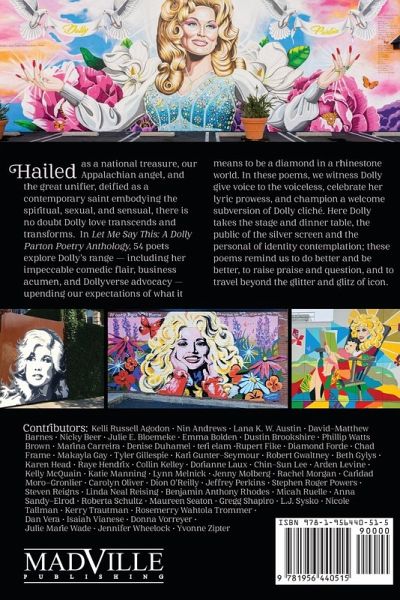 Let Me Say This: A Dolly Parton Poetry Anthology offers 54 poets' takes on often-unsung facets of this diamond in a rhinestone world-calling in Dolly's impeccable comedic timing, her lyric mastery, her business acumen, and her Dollyverse advocacy. These poems remind us to be better and to do better, to subvert Dolly cliché, and they encourage us to weave Dolly metaphor into our own family lore. Within these pages, Dolly takes the stage and the dinner table; readers see the public Dolly of the silver screen and the private Dolly of identity contemplation. Dolly raises praise and question, and she butterflies into our hearts to unabashedly to claim the mantra In Dolly We Trust.With Dolly poems from 54 contributors: Kelli Russell Agodon - Nin Andrews - Lana K. W. Austin - David-Matthew Barnes - Nicky Beer - Julie E. Bloemeke - Emma Bolden - Dustin Brookshire - Phillip Watts Brown - Marina Carreira - Denise Duhamel - teri elam - Rupert Fike - Diamond Forde - Chad Frame - Makayla Gay - Tyler Gillespie - Kari Gunter-Seymour - Robert Gwaltney - Beth Gylys - Karen Head - Raye Hendrix - Collin Kelley - Dorianne Laux - Chin-Sun Lee - Arden Levine - Katie Manning - Kelly McQuain - Lynn Melnick - Jenny Molberg - Rachel Morgan - Caridad Moro-Gronlier - Carolyn Oliver - Dion O'Reilly - Jeffrey Perkins - Stephen Roger Powers - Steven Reigns - Linda Neal Reising - Benjamin Anthony Rhodes - Micah Ruelle - Anna Sandy-Elrod - Roberta Schultz - Maureen Seaton - Gregg Shapiro - L.J. Sysko - Nicole Tallman - Kerry Trautman - Rosemerry Wahtola Trommer - Dan Vera - Isaiah Vianese - Donna Vorreyer - Julie Marie Wade - Jennifer Wheelock - Yvonne Zipter