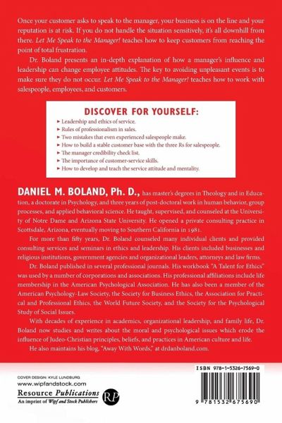 Once your customer asks to speak to the manager, your business is on the line and your reputation is at risk. If you do not handle the situation sensitively, it's all downhill from there. Let Me Speak to the Manager! teaches how to keep customers from reaching the point of total frustration. Dr. Boland presents an in-depth explanation of how a manager's influence and leadership can change employee attitudes. The key to avoiding unpleasant events is to make sure they do not occur. Let Me Speak to the Manager! teaches how to work with salespeople, employees, and customers.