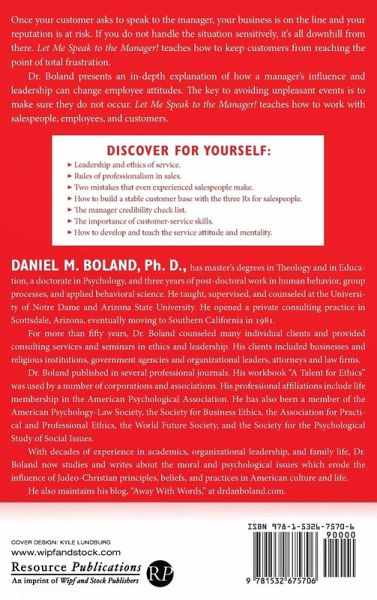 Once your customer asks to speak to the manager, your business is on the line and your reputation is at risk. If you do not handle the situation sensitively, it's all downhill from there. Let Me Speak to the Manager! teaches how to keep customers from reaching the point of total frustration. Dr. Boland presents an in-depth explanation of how a manager's influence and leadership can change employee attitudes. The key to avoiding unpleasant events is to make sure they do not occur. Let Me Speak to the Manager! teaches how to work with salespeople, employees, and customers.