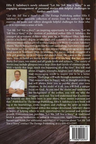 Let Me Tell You a Story engaging arrangement of personal stories and helpful challenges to further one's faith. "Let Me Tell You a Story" from The Ewings Publishing author Elfie F. Salisbury is an enjoyable collection of stories from the author's life that examine the peaks and valleys alongside helpful challenges for those who seek to rejuvenate a sense of faith. "Let Me Tell You a Story": an inspiring opportunity for reflection. "Let Me Tell You a Story" is the creation of published author Elfie F. Salisbury, the youngest of seventeen children who grew up in Northeast Ohio. Salisbury carries a bachelor's degree in education and a master's degree in education administration and has served in education for over thirty-five years. Salisbury shares, "Rarely does a book quite like this one come along. Each story is unique". The stories are true insights into an epic journey of life growing up in a small rural town in Northeast Ohio. In addition, the stories include struggles of a little girl growing up in a Pentecostal church from the 1960s to the present years. Also included are stories about a career in teaching that has spanned thirty-five years, two states, and all grade levels and subjects. "The variety of stories may include glimpses into a large close-knit family of nineteen people. With a family that large, much was happening all of the time". You will read about struggles, triumphs, laughter, and challenges, and read encouraging words to inspire you to be a better person. "Each page will walk through a moment in time. That moment may be happy, sad, or thought-provoking but will always leave you to ponder about your own situation. In the midst of it all, you will find a unique focus on God. As you read the stories and understand the background of the author, you will see why the struggles were real. You will understand that if someone can honestly say they have been in your shoes, these stories represent just that." Published by The Ewings Publishing, Elfie F. Salisbury's new book will tug at the heartstrings, evoke laughter, and challenge the spirit as readers consider the messages found within this unique devotional. Salisbury shares in hopes of helping others to seek opportunities for personal and spiritual growth. Consumers can purchase "Let Me Tell You a Story" at traditional brick & mortar bookstores, or online at Amazon.com, Apple iTunes store, or Barnes and Noble. For additional information or inquiries about "Let Me Tell You a Story," contact The Ewings Publishing at (1) 888-421-2397.