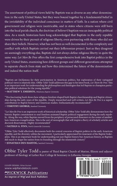 The assortment of political views held by Baptists was as diverse as any other denomination in the early United States, but they were bound together by a fundamental belief in the inviolability of the individual conscience in matters of faith. In a nation where civil government and religion were inextricable, and in states where citizens were still born into the local parish church, the doctrine of believer's baptism was an inescapably political idea. As a result, historians have long acknowledged that Baptists in the early republic were driven by their pursuit of religious liberty, even partnering with those who did not share their beliefs. However, what has not been as well documented is the complexity and conflict with which Baptists carried out their Jeffersonian project. Just as they disagreed on seemingly everything else, Baptists did not always define religious liberty in quite the same way. Let Men Be Free offers the first comprehensive look into Baptist politics in the early United States, examining how different groups and different generations attempted to separate church from state and how this determined the future of the denomination and indeed the nation itself.