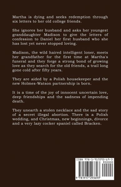 Martha is dying and seeks redemption through six letters to her old college friends. She ignores her husband and asks her youngest granddaughter Madison to give the letters of confession to Daniel her first husband who she has lost yet never stopped loving. Madison, the wild haired intelligent loner, meets her grandfather for the first time at Martha's funeral and they forge a strong bond of growing love as they search for the old friends, a trail long gone cold after fifty years. They are aided by a Polish housekeeper and the new Holmes-Watson partnership is born. It is a time of the joy of innocent uncertain love, deep friendships and the sadness of impending death. They unearth a stolen necklace and the sad story of a secret illegal abortion. There is a Polish wedding, and Christmas, new beginnings, divorce and a very lazy cocker spaniel called Bracken.
