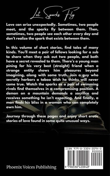 Love can arise unexpectedly. Sometimes, two people meet, and the sparks fly between them. Then, sometimes, two people see each other every day, and don't realize the spark that exists between them. In this volume of short stories, find tales of many kinds. You'll meet a pair of fellows looking for a sub to share when they ask out two people and both have a secret revealed to them. There's a young man pining for his very best (straight) friend when a strange entity shows him pleasures beyond imagining, along with some truth. Join a guy who secretly harbors a taboo wish he thinks will never come true. Watch the sparks as a pair of swimming rivals find themselves in a compromising position. A demon on a mountain demands a sacrifice and receives something he isn't expecting. And finally, a man finds his bliss in a woman who can completely own him. Journey through these pages and enjoy short erotic stories of love found in some quite unusual ways.