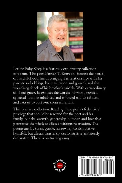 Let the Baby Sleep is a fearlessly exploratory collection of poems. The poet, Patrick T. Reardon, dissects the world of his childhood, his upbringing, his relationships with his parents and siblings, his maturation and growth, and the wrenching shock of his brother's suicide. With extraordinary skill and grace, he exposes the worlds-physical, mental, spiritual-that he inhabited and is forced still to inhabit, and asks us to confront them with him. This is a rare collection. Reading these poems feels like a privilege that should be reserved for the poet and his family, but the warmth, generosity, humour, and love that permeates the whole is offered without reservation. The poems are, by turns, gentle, harrowing, contemplative, heartfelt, but always insistently demonstrative, insistently declarative. There is no turning away.