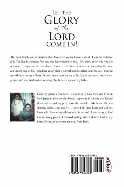 The book touches on devastation that domestic violence has on a child. I was the recipient of it. You live in constant fear, and you lose yourself in that. You don't know who you are as you are trying to survive the chaos. You leave the home; you have no idea what direction you should take in life. You don't know what is normal and this affect your choices. You end up with hurt on top of hurt. It took many years for me to let God in my heart, but He was patient with me. God had an amazing plan between me and my father. I was my parent's first born. I was born in New York and lived in New Jersey in my early childhood. I grew up in a home that looked clean and everything perfect on the outside. My home life was chaotic, violent and abusive. I carried all these hurts and did not know what love was much less what is normal. I was trying to find love in wrong places. I received healing when I allowed God in my heart after many years staying away from Him.