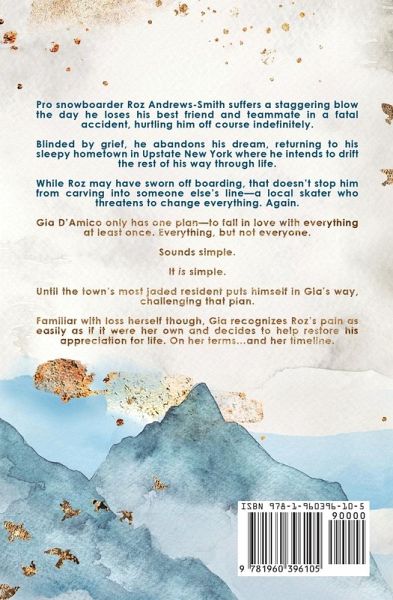Pro snowboarder Roz Andrews-Smith suffers a staggering blow the day he loses his best friend and teammate in a fatal accident, hurtling him off course indefinitely. Blinded by grief, he abandons his dream, returning to his sleepy hometown in upstate New York where he intends to drift the rest of his way through life. While Roz may have sworn off boarding, that doesn't stop him from carving into someone else's line-a local skater who threatens to change everything. Again. Gia D'Amico only has one plan-to fall in love with everything at least once. Everything, but not everyone. Sounds simple. It is simple. Until the town's most jaded resident puts himself in Gia's way, challenging that plan. Familiar with loss herself though, Gia recognizes Roz's pain as easily as if it were her own and decides to help restore his appreciation for life. On her terms...and her timeline.