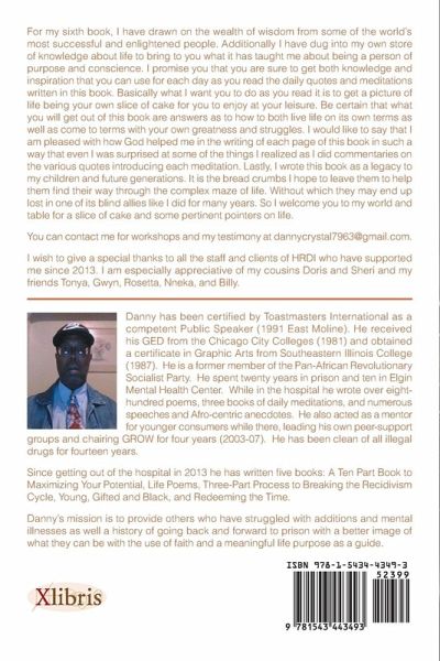 For my sixth book, I have drawn on the wealth of wisdom from some of the world’s most successful and enlightened people. Additionally I have dug into my own store of knowledge about life to bring to you what it has taught me about being a person of purpose and conscience. I promise you that you are sure to get both knowledge and inspiration that you can use for each day as you read the daily quotes and meditations written in this book. Basically what I want you to do as you read it is to get a picture of life being your own slice of cake for you to enjoy at your leisure. Be certain that what you will get out of this book are answers as to how to both live life on its own terms as well as come to terms with your own greatness and struggles. I would like to say that I am pleased with how God helped me in the writing of each page of this book in such a way that even I was surprised at some of the things I realized as I did commentaries on the various quotes introducing each meditation. Lastly, I wrote this book as a legacy to my children and future generations. It is the bread crumbs I hope to leave them to help them find their way through the complex maze of life. Without which they may end up lost in one of its blind allies like I did for many years. So I welcome you to my world and table for a slice of cake and some pertinent pointers on life. You can contact me for workshops and my testimony at dannycrystal7963@gmail.com. I wish to give a special thanks to all the staff and clients of HRDI who have supported me since 2013. I am especially appreciative of my cousins Doris and Sheri and my friends Tonya, Gwyn, Rosetta, Nneka, and Billy.