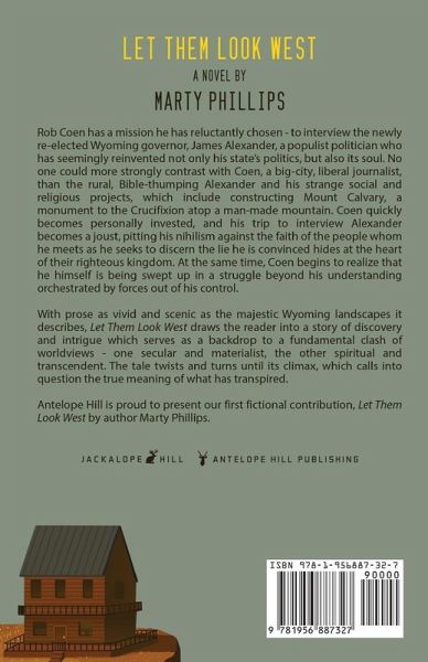 Rob Coen has a mission he has reluctantly chosen - to interview the newly re-elected Wyoming governor, James Alexander, a populist politician who has seemingly reinvented not only his state's politics, but also its soul. No one could more strongly contrast with Coen, a big-city, liberal journalist, than the rural, Bible-thumping Alexander and his strange social and religious projects, which include constructing Mount Calvary, a monument to the Crucifixion atop a man-made mountain. Coen quickly becomes personally invested, and his trip to interview Alexander becomes a joust, pitting his nihilism against the faith of the people whom he meets as he seeks to discern the lie he is convinced hides at the heart of their righteous kingdom. At the same time, Coen begins to realize that he himself is being swept up in a struggle beyond his understanding orchestrated by forces out of his control. With prose as vivid and scenic as the majestic Wyoming landscapes it describes, Let Them Look West draws the reader into a story of discovery and intrigue which serves as a backdrop to a fundamental clash of worldviews - one secular and materialist, the other spiritual and transcendent. The tale twists and turns until its climax, which calls into question the true meaning of what has transpired. Antelope Hill is proud to present our first fictional contribution, Let Them Look West by author Marty Phillips.