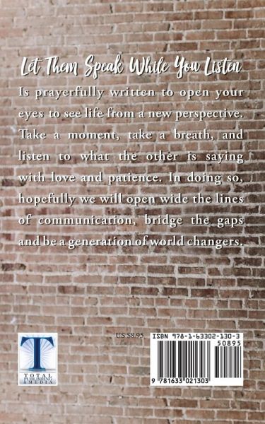 Let Them Speak While You Listen Is prayerfully written to open your eyes to see life from a new perspective. Take a moment, take a breath, and listen to what the other is saying with love and patience. In doing so, hopefully we will open wide the lines of communication, bridge the gaps and be a generation of world changers. Tina Bill is not only the author of the book "Let Them Speak While You Listen." She is wife to her adoring husband Randy Bill for over 31 years, and the devoted mother of two beautiful children Isaiah and Hannah. She is a mother to many nonbiological children and lovingly known to them as "Momma Tina." Tina connected with them in many different ways through her musical talents and abilities. Her heart is an endless well of grace to those who are in need of love, affection or who may need a listening ear. She has been a rock to her youth group, small group and those she serves alongside of. She values time spent with her adopted children whose ethnicities range from Shri Lankan, African American, Russian, American Indian, Asian Indian, Arabic, just to name a few. She is passionate about God and is determined to walk out her love for Christ daily.